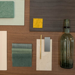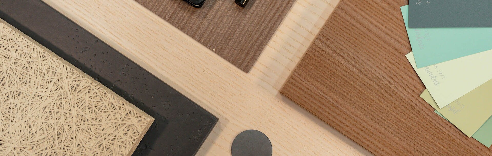 Auf den Woodboards für den Innenbereich sind unterschiedlich gebeizte Hölzer mit weiteren Materialien wie Griffen, Polsterbezügen oder Wandfarben kombiniert