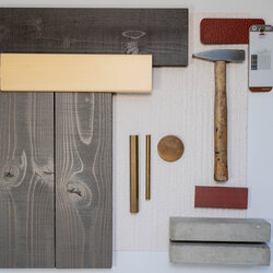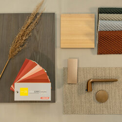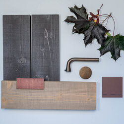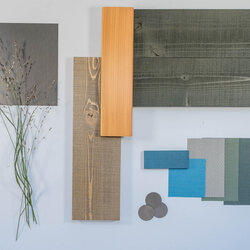 Materialboards für den Außenbereich zeigen Gestaltungsmöglichkeiten für beschichtete Holzfenster und -fassaden gemeinsam mit weiteren Materialien wie z.B. Griffen oder Verblechungen.
