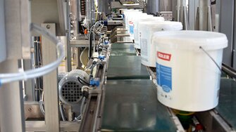 Ein zentraler Baustein dabei ist ein hochmodernes System von Molchleitungen: 13 Leitungen mit insgesamt 2 km Länge wurden in der Halle verlegt. Der „Molch“ sorgt dafür, dass exakt die richtige Menge an Wasser, Bindemittel oder fertigem Lack von einem Tank in den anderen übertragen und die Leitung gleichzeitig gereinigt wird. Das garantiert schnelle und flexible Abläufe und minimiert Materialverluste. Als letztes Puzzlestück wurde eine vollautomatische Abfüllanlage installiert: Ein hochmoderner Roboter palettiert dort Gebinde vom 3-Liter- bis zum 27-Liter-Eimer. Gleichzeitig erstellt die Anlage die passenden Etiketten und klebt sie auf das Gebinde.