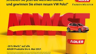 Während Sie den Zaun neu streichen, streichen wir Ihnen die Mehrwertsteuer. Und mit ein bisschen Extra-Glück rauschen Sie in Zukunft wie der rote Blitz über die Straßen: Beim großen ADLER-Gewinnspiel gibt es heuer nämlich einen VW Polo zu gewinnen – so rot wie die Tulpen im Frühlingsbeet. Mitmachen können Sie online unter www.adler-farbenmeister.com oder noch besser direkt bei Ihrem ADLER-Farbenmeister.