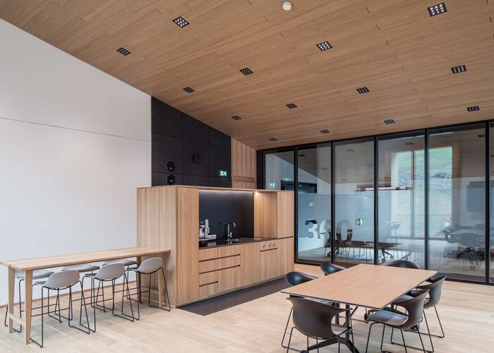 Verantwortlich für die Schindelfassade sowie die übrigen Holzbauarbeiten zeichnete die Ötztaler Zimmerei Franz Thurner. Die Zusammenarbeit mit regionalen Unternehmen war ebenso Teil der konsequenten Nachhaltigkeits-Philosophie, mit der obermoser + partner das Projekt umsetzten, wie die Verwendung heimischer Materialien mit kurzen Lieferwegen. Das gilt nicht nur für das Holz, sondern auch für dessen Beschichtung mit den Produkten des Tiroler Lackherstellers ADLER. So erhielten die Möbel aus der Werkstätte der Ötztaler Tischlerei Josef Riml mit ADLER PUR-Naturmatt eine natürlich-matte Optik. Die Lärchenholzfenster wurden vom Südtiroler Hersteller Tip Top Fenster in einem hellen, natürlichen Farbton lasiert. Die asymmetrisch platzierten Fenster erzeugen einen deutlichen Kontrast zur geschlossenen grauen Fassade und verleihen dem neu errichteten Gebäude eine zeitgemäße Ausstrahlung. Die ungewöhnliche Geometrie des Gebäudes wird durch schräg geneigte Fassaden veranschaulicht, die eine Neigung nach Westen aufweisen und über den neu gestalteten Vorplatz hinausragen. Ein durchgehender Bodenbelag verbindet die dadurch entstandene Flaniermeile am Ufer der Ötztaler Ache mit dem Erdgeschoss der Tourismus-Zentrale, welches mit einer rundum verglasten Pfosten-Riegel- Fassade ausgeführt wurde. Es lädt die Gäste ein, einzutreten und sich über das touristische Angebot des Ötztals zu informieren. Die in den oberen Stockwerken untergebrachten Büros und Besprechungsräume scheinen darüber zu schweben. So fungiert des Gebäude nicht nur als neue Heimat für das Team von Ötztal Tourismus, sondern erhebt zugleich den Anspruch eines architektonischen Wahrzeichens im Ortskern von Sölden, in dem sich Tradition und Moderne verbinden.