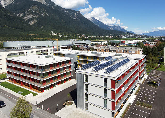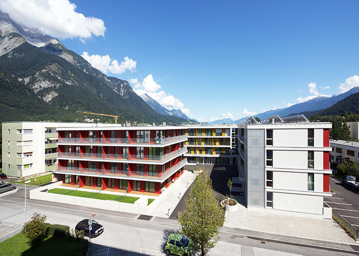 Die Häuser gruppieren sich jeweils um einen gemeinsamen Erschließungshof und eröffnen spannenden Weg- und Blickbeziehungen. So ist ein neues Zentrum in dem schnell wachsenden Vorort der Tiroler Landeshauptstadt Innsbruck entstanden.