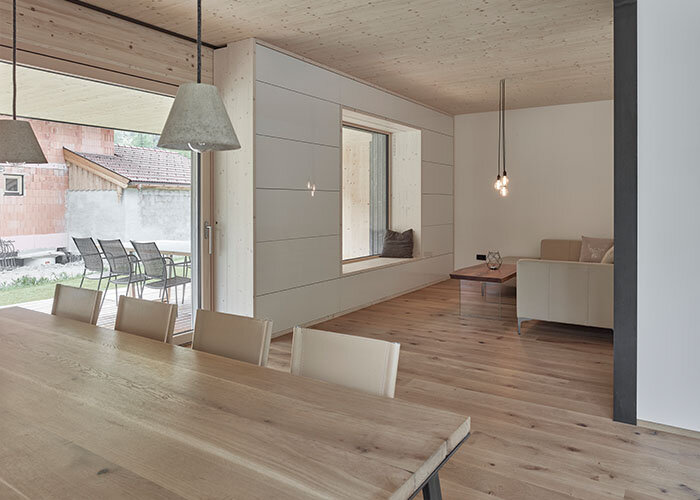 Auch im Innenbereich griffen Aigner und sein Freund zum Farbtopf. „Wir haben alle sichtbaren Massivholzflächen mit ADLER Lignovit Interior UV100 im leicht weißlichen Farbton Tanne veredelt“, erzählt der Holzbau- Profi. Die Lasur bewahrt die natürliche Schönheit des Holzes und schützt sie vor dem Vergilben. „Mittlerweile lade ich immer wieder Kunden zu mir nach Hause ein, um ihnen die Oberfläche zu zeigen und sie von den Vorteilen einer Beschichtung zu überzeugen“, sagt Aigner. Gerade im Vergleich zu unbeschichteten Holzteilen kommt die helle Lasur sehr gut an. Und so schließt sich der Kreis und lässt sich der nächste Bauherr von einem schönen Meiberger-Holzhaus inspirieren …