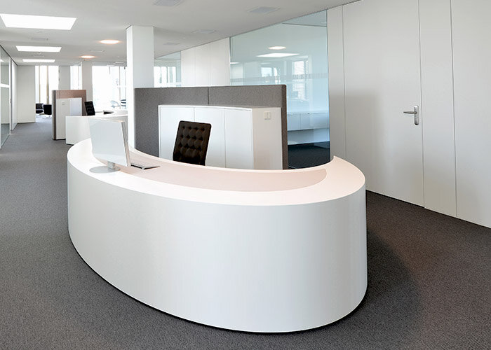 Reduziert, dezent, elegant: So präsentiert sich die Empfangstheke der neuen Donau-Iller-Bank in Ehingen, Baden-Württemberg, Deutschland.Und gerade in ihrer Schlichtheit zieht das Möbel die Besucher in seinen Bann. Es ist die außergewöhnliche Form, die besondere Farbe und die vollendete Gestaltung, die den Eingangsbereich zum Hingucker machen und perfekt vermitteln, was man als Bank ausdrücken will: Hier herrscht Offenheit, Transparenz – und das alles mit dem gewissen bisschen Schwung. Denn die Empfangstheke ist geschwungen. In einer sanften Sichelform schmiegt sie sich um die Mitarbeiter und wird mit der Rückwand zur Ellipse.