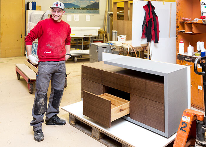 Er hat Freude am Beruf und ist stets interessiert. So beschreibt sich Fabian von Dach selbst, Lehrling im zweiten Lehrjahr bei der schweizerischen Gehri AG – Planung und Produktion von Raumeinrichtungen. Das dürften wohl die besten Voraussetzungen sein, um ein guter Schreiner zu werden und auch, um in einem Wettbewerb mit einem selbst designten und gebauten Möbelstück zu bestehen. Für letzteres legt Fabian mit seinem „Sideboard im Betonmantel“ beim Lehrlingswettbewerb der Schreinermeisterverbände im Kanton Bern den stilsicheren Beweis vor.