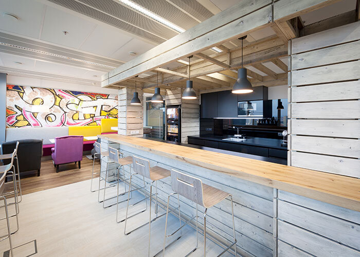 Die Pausenbereiche tragen die Handschrift der Alcatel-Lucent Mitarbeiterinnen und Mitarbeiter. Möbel, Farben und Oberflächen sind das Ergebnis eines gemeinsamen, kreativen Prozesses, der den Leuten die Chance zur Entfaltung von Stärken gibt und sie stolz macht auf ihren Beitrag zum Erfolg“, erklärt Architekt Klaus Rösel. Die natürlichen Holzflächen im wohnlichen und doch modernen Vintage-Look waren Teil dieses Prozesses und es nimmt nicht wunder, dass sich die Menschen für die Umgebung, in der sie den Großteil ihres Tages verbringen, natürliche Materialien wie Holz wünschen. So viel Individualität lässt sich mit Planern wie Klaus Rösel von Interpool und Ausführern wie der Tischlerei Krumböck umsetzen. Und am Ende haben 170 Menschen einen Arbeitsplatz, der sehr viel mehr ist, als ein Büro, in das sie morgens rein- und abends wieder rausgehen.