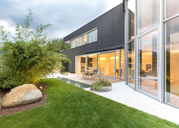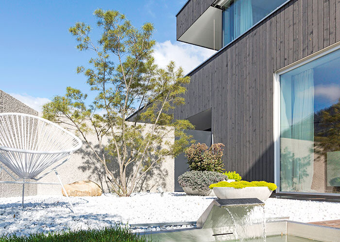 Und so entwickelten Planer und Auftraggeber als zentrales Element eine zweigeschossige, nach oben offene Ellipse: Wie ein Pavillon thront diese mitten im Garten und bindet ihn gleich in die Wohnsituation ein. Überdimensionale Fensterfronten öffnen sich zu einem privaten Patio mit Ahornbaum und einer großzügigen Wasserfläche als Vogeltränke. Die weiteren Räume wurden entlang des steilen Hanges situiert, diesmal mit einer geraden, kantigen Linienführung. Ein schöner Kontrast zu den Rundungen des Gartenturms. Ausgeführt wurde das Gebäude in nur sieben Monaten als Massivbau mit einer vorgehängten Fichtenfassade: Der Oberfläche verleiht eine Beschichtung von ADLER den gewünschten edlen, dunkelgrauen Look. Dafür wurde Pullex Silverwood im Farbton Graualuminium 2:1 mit Pullex Color RAL 9005 abgemischt und zwei Mal auf die sägerauen Fichtenbretter aufgebracht.