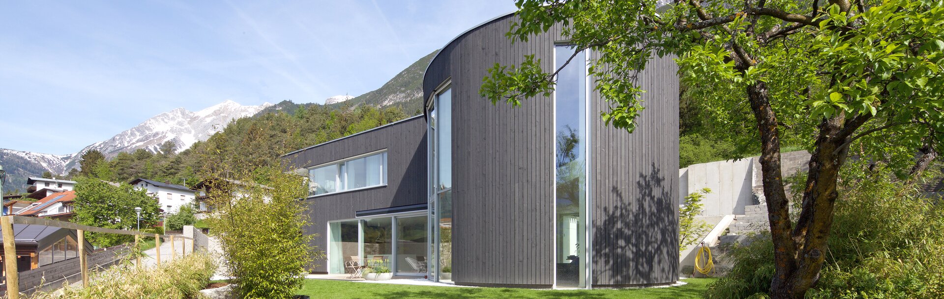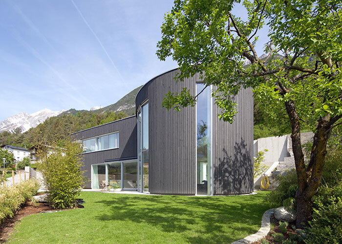 Das Haus M hoch über Landeck ist ein echter Wohntraum. Eine gelungene Kombination aus rund und eckig, perfekt platziert und ausgeführt. Kaum vorstellbar, dass hier noch vor wenigen Monaten ein unscheinbares, typisches Tiroler Einfamilienhaus aus den Sechziger Jahren stand. Ein Haus, in dem der Bauherr aufwuchs und das er nun gemeinsam mit seiner Mutter weiter bewohnen wollte. Allein, die gewünschten zwei Wohneinheiten ließen sich in dem sanierungsbedürftigen Gebäude nicht realisieren und so entschlossen sich die Bewohner kurzerhand zum Abriss und Neubau: „Das gab uns die Möglichkeit, den Bauplatz neu zu definieren“, erzählt Architekt Harald Kröpfl. Dabei kam ihm das detaillierte Wissen des Bauherren über diesen Ort zugute: Er konnte genau sagen, wie hier im Sommer oder Winter die Sonne stand, welche Sichtachsen zu markanten Geländepunkten eingehalten werden wollten, welche Einblicke ermöglicht und welche vermieden werden sollte