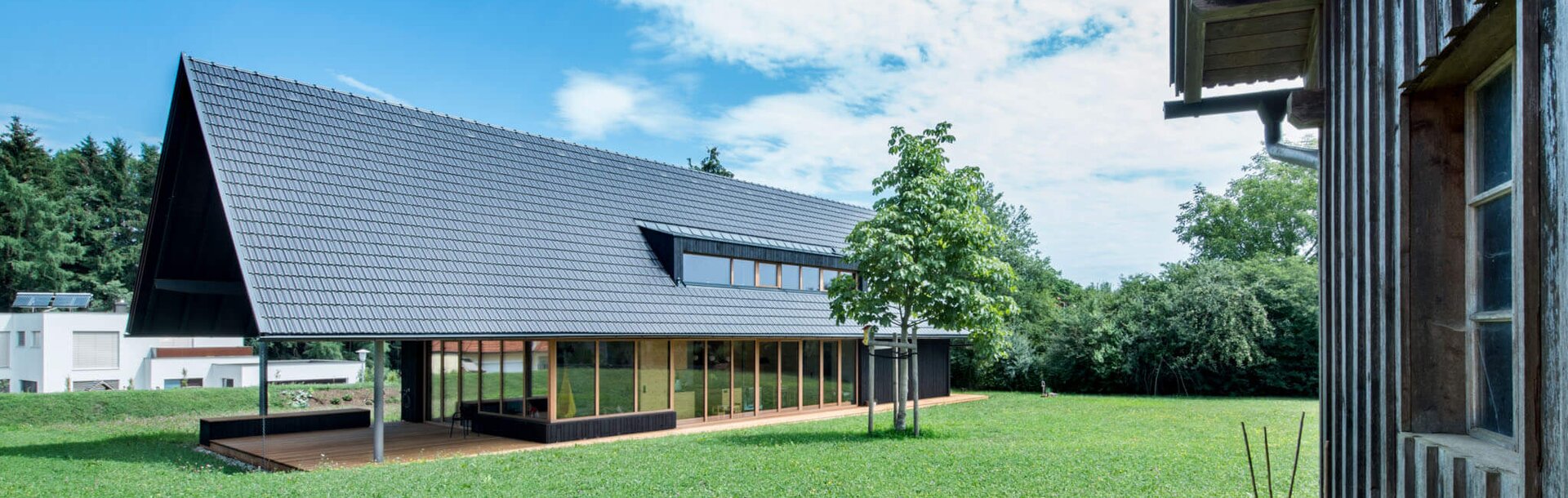 Genau dieses Dach wurde zum entscheidenden Gestaltungselement: Bogenfeld Architekten setzten ein großes Satteldach auf einen langgestreckten, lichten Bau. Das Dach spendet Schatten, bietet witterungsgeschützte Freiflächen, legt sich wie ein schützender Schirm über die großzügigen Glasfronten. An der Nordseite entstand eine großzügige Nische als Eingangsbereich. Durch die hellen, mit farblosem Pullex Holzöl von ADLER behandelten Dreischichtplatten in Lärchenholz wirkt er freundlich und einladend. Ebenfalls ein Öl, nämlich ADLER Aquawood Lärchenöl, kam für die Fenster der Firma Böhler zum Einsatz, die von den Montageexperten des Unternehmens Palisa eingebaut wurden und die Süd- und Westseite charakterisieren. Die sägeraue Fichtenholzfassade nimmt hingegen das Motiv eines alten Holzschuppens auf dem Grundstück auf: Der Bauherr selbst hat mit Familie und Freunden jedes einzelne Brett mit Pullex 3in1-Lasur im Farbton Wenge gestrichen. Durch die dunkelbraune Beschichtung schimmert die Holzmaserung besonders schön und weckt die Assoziation zum Pferdefell. Außer der Bodenplatte, dem Sanitärkern und dem Treppenhaus – das die etwaige spätere Teilung möglich macht – besteht das Gebäude zur Gänze aus Holz. Für den angepeilten Preis ist das wohl eine ideale Ausgangsposition!