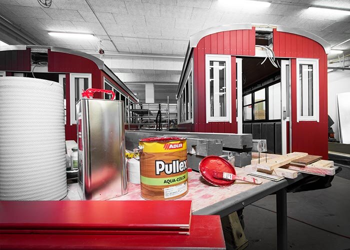 Und hier kommt die Tischlerei Johann Prommegger GmbH aus Grosal ins Spiel, zeichnet Konstruktionspläne, wählt die passenden Produkte und baut Gondel für Gondel die einzelnen Bauteile, die dann von der Schwaiger Konstruktions GmbH zusammengesetzt werden. Die Unterkonstruktion wird in Fichtenholz ausgeführt und mit ADLER VariColor im Farbton RAL 9005 tiefschwarz gestrichen. Die Außenschalung, ebenfalls in Fichte, musste der Breite der historischen Gondeln entsprechen, es gab also wenig Spielraum für ideale Lösungen, die die Tischlerei Prommegger aber dennoch fand. Die Gondeln in ihrem historischen, „kaiserlichen“ Rot erstrahlen zu lassen, war hingegen nicht schwierig: Für guten Schutz und lange Haltbarkeit wurde einmal mit Pullex Aqua-IG von ADLER grundiert. Für den royalen Anstrich im Farbton Signalrot sorgen zwei Schichten Pullex Aqua-Color. Alles auf umweltfreundlicher Wasserbasis, denn man muss ja nicht in jeder Hinsicht in der Vergangenheit bleiben.
