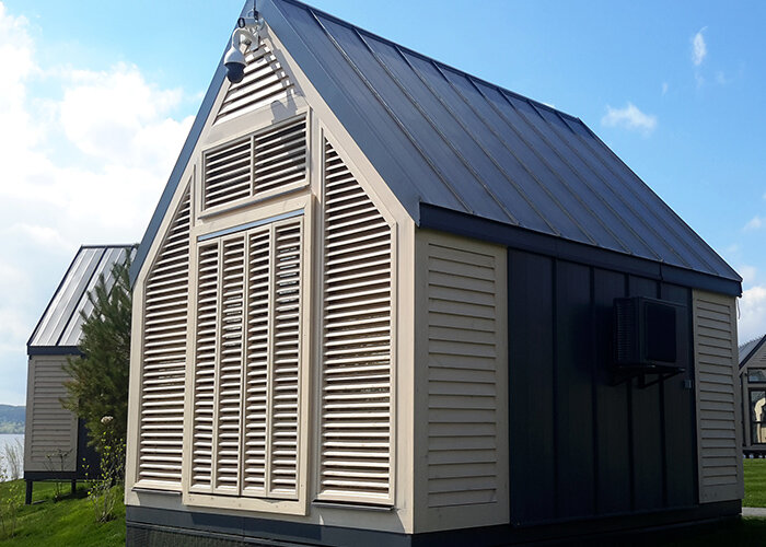 Das Ökoresort Kilov liegt im pittoresken Umland von Kiew, am Fluss Dniper. Es ist weit genug weg, um all den Lärm und Trubel der Großstadt vergessen zu machen, und doch nah genug, um den Hauptstädtern ein ideales Wochenend- und Urlaubsziel zu sein. Für das Freizeitprogramm sorgt Mutter Natur selbst: Frische Luft und lichter Wald laden zu Wanderungen ein, doch die Hauptattraktion ist das Wasser: Ein Großteil der Besucherinnen und Besucher kommt zum Fischen hierher. Aufgrund der Nähe zum Wasser und des zu weichen Untergrunds aus Torferde entschied man sich für zwei Arten von Ferienhäuschen: beide direkt im Wasser, anstatt nur am Wasser. Die Gebäude sind auf schwimmenden Trägerflächen nach Art von Hausbooten oder auf Pfahlgerüsten errichtet. In Form und Material erinnern die zweigeschossigen Holzhäuschen mit Satteldach an die gute alte Datscha von früher, warten jedoch innen mit jeglichem Komfort auf und bieten mit bodentiefen, großflächigen Fensterfronten eine wunderbare Sicht auf den Dniper und das Umland.
