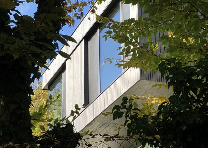 Dabei spielte Eichenseher die Topographie in die Hände: Das Gebäude schmiegt sich an Stelle eines ehemaligen Wirtschaftsbaus an einen kleinen Hang, nur das obere Stockwerk ragt keck hervor. Und zwar in doppeltem Sinne – weil es auch über das Untergeschoß auskragt. Im Gegensatz zu selbigem, das durch eine weiß verputzte Fassade ein massives und selbstbewusstes Statement abgibt, wirkt der Aufbau leicht, fast schwebend. Dafür sorgt die Holzverkleidung aus sibirischer Lärche, die Eichenseher den tragenden Betonwänden übergezogen hat: Elemente in unterschiedlichen Breiten betonen die raumhohen Verglasungen, umrahmt von Dachrand und Sockel. Für den Nadelstreif-Look des Nadelholzes sorgt Pullex Silverwood von ADLER – der Farbton Graualuminium wurde noch zusätzlich mit Pullex Color RAL 9005 (Tiefschwarz) abgetönt, um eine besonders stilvolle graphitfarbene Optik zu erzielen. Eben edel und alle Blicke auf sich ziehend – wie es halt so ist, wenn mitten im Grün ein Anzugträger daherkommt!