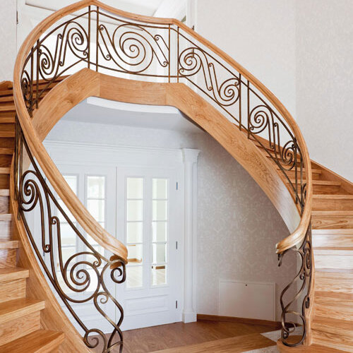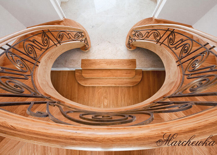 Dieser grenzüberschreitende Auftrag war für die Firma, die in der Nähe von Wrotzlaw (Breslau) situiert ist, eine Herausforderung. Nicht, weil Marchewka den Umgang mit anspruchsvoller, internationaler Kundschaft nicht gewöhnt wäre, sondern weil der Transport von neun Meter langen Dielen bei dieser Entfernung nun mal kein Kinderspiel ist. Aber dass die Bodenbretter aus einem Stück gefertigt sind, ist für Marchewka selbstverständlich. Die Herausforderung wurde also gemeistert, genauso wie die Herausforderung, die die doppelt gebogenen Treppen und Geländer darstellten. Dafür hat der Treppenhersteller eigens Schablonen angefertigt.