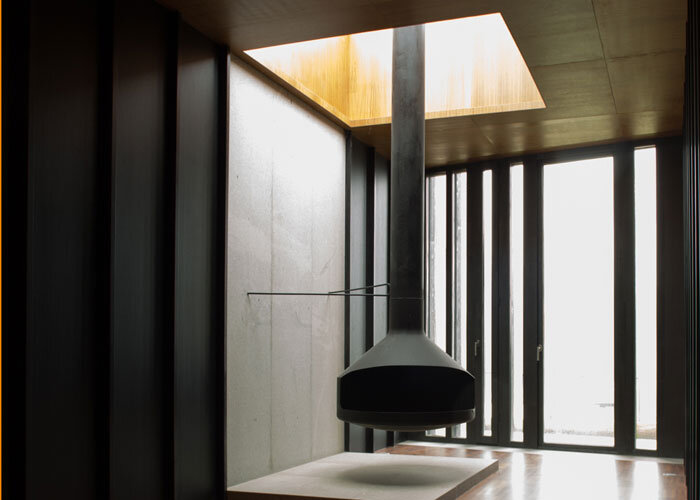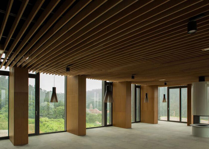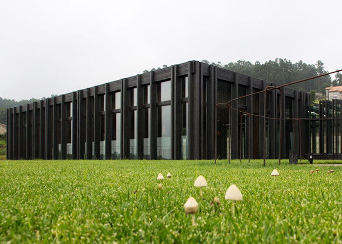Nebelschwaden ziehen über den Hang am Waldrand. Wir befinden uns in der ländlichen Umgebung von Armenteira, wo diese Unterkunft entstanden ist, die mit unseren herkömmlichen Vorstellungen von Tourismus nichts zu tun hat. Die Nachbarschaft: kleine Einfamilienhäuser und bewirtschaftete Höfe. Die Gegend ist ein natürliches und kulturelles Schutzgebiet, dank ihrer Nähe zum Kloster. Entsprechend schonend musste geplant und gebaut werden. Deshalb legte Architekt Martínez das Gebäude in Terrassen an, so dass es sich eng an den Hang schmiegt. Die versetzten Stockwerke verschwinden sogar teilweise im Hang, die Vegetation setzt sich über ihren Dächern fort. Bogengänge aus Stein und Holzstämmen, die an die Weinkeller des Klosters erinnern, führen unter die Erde. Luft bekommen diese Gebäudeteile durch ein ausgeklügeltes Belüftungssystem, durch das die Waldluft ins Innere strömen kann. Licht bekommen sie über Glaspyramiden, deren Spitzen eine Entlüftung für dunkle Kamine bildet, die sich inmitten der Pyramiden erheben. Sie leiten den Rauch von offenen Feuerstellen im Gebäude nach außen, deren Vorbilder die Öfen der Mönche in Santa María sind.