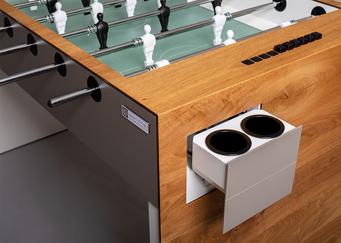 Jeder Tisch Marke Bankhamer ist ein Unikat, maßgeschneidert nach den Vorstellungen des Kunden. Von den Spielfiguren und Griffen bis zur Oberflächengestaltung kann der Käufer aus zahllosen Varianten auswählen. Gefertigt werden die Wuzler dann in Bankhamers Partnerunternehmen, der Möbelwerkstätte Enghuber. „Individuelle Möbel für individuelle Menschen“ lautet das Firmenmotto der Tischlerei, die in dritter Generation von den Tischlermeistern Dominik Enghuber und Michael Birglechner geführt wird. Diesem Prinzip bleiben sie auch bei den Fußballtischen treu. Vor allem der Korpus bietet Raum zur kreativen Gestaltung: Die Palette reicht von der puristischen Variante mit weiß lackierten MDF-Platten – Enghuber setzt dafür auf die effiziente Beschichtung Aduro MDF-4in1 von ADLER – bis hin zum Natur-Look, für den die Asteiche gespachtelt, gebürstet und mit ADLER Legnopur lackiert wird. Bei Unternehmen beliebt sind auch „gebrandete“ Tischfußballtische, für die das Firmenlogo mittels Einlegearbeit oder CNC-Fräsung in den Korpus eingearbeitet wird. „Nicht umsonst stellen innovative Unternehmen wie Google ihren Mitarbeitern Tischfußballtische zur Verfügung: Beim gemeinsamen Spielen bekommt man den Kopf frei, Kreativität und Teamgeist werden gefördert“, erklärt Bankhamer.