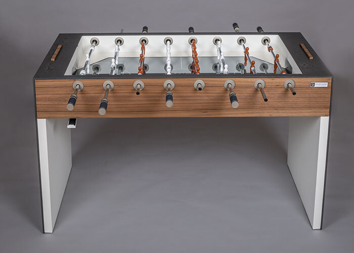 Jüngstes Highlight im Sortiment von Bankhamer und Enghuber ist die „Limited Edition Serie“: 33 „Wunder-Wuzler“ in Luxusqualität, die vor allem durch ihre außergewöhnliche Oberflächengestaltung bestechen. Edles Holz trifft hier auf die raue Optik von Schalungsbeton. Die Seitenwände aus Nussbaumfurnier sowie das Zählwerk aus massivem Nussholz sind für eine natürliche Optik und Haptik mit ADLER Legno-Öl behandelt. Auch der Beton stammt aus der ADLER-Dose: Enghuber verwendet dazu den Echtbeton-Lack Bluefin Pure-Concrete, der in sechs Farbvarianten vom dunklen „Black Panther“ bis zum „White Wolf“ angeboten wird. Eine abschließende Schicht ADLER Aqua-Top Antiscratch im stumpfmatten Glanzgrad G5 sorgt für verlässlichen Schutz, damit der Tisch auch dem hitzigsten Spiel gewachsen ist. Denn schließlich sollen die Wuzler nicht nur gut aussehen, sondern auch Spaß machen – und der ist mit diesem einzigartigen Spielzeug für große und kleine Fußball-Künstler garantiert.