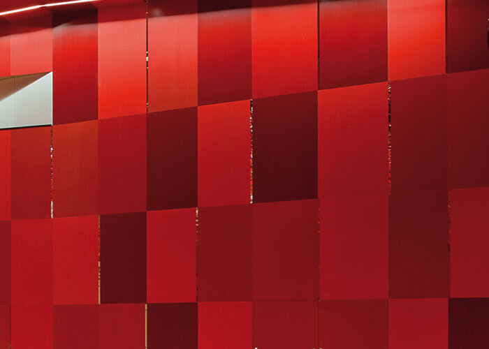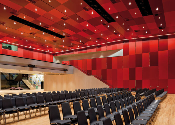 Außerdem dient das Foyer als Verteilerraum für drei völlig verschiedenartig gestaltete Räume: Stadtsaal, Lounge und Seminarräume. Das eigentliche Herz des SZentrums, der Stadtsaal, ist in vier verschiedenen Rottönen gestaltet. Sie alle stammen aus dem ADLER-Farbfächer und tragen klingende Namen: Kaki, Gipfelstürmer, Red, Red, Wine, und Jägermeister sind es, die den Gästen Herzlichkeit und Festlichkeit vermitteln. Decken und Wände bestehen aus rechteckig kombinierten Platten, die in je einem dieser Farbtöne mit ADLER Pigmopur lackiert sind. Das lässt den Raum groß und belebt wirken. Einzelne Elemente, wie die Tribüne sind silbern mit ADLER Metallic Base lackiert.