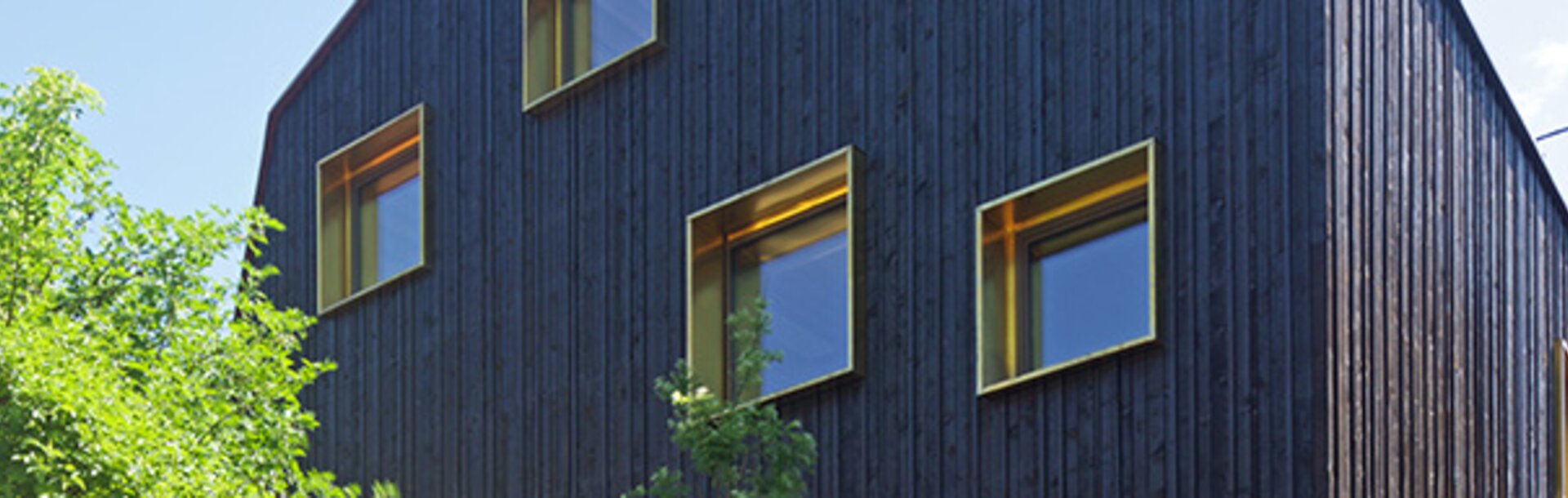 „Wir haben die Fassade thermisch sanieren lassen und in Anlehnung an die im dörflichen Kontext vorgefundenen Materialien durchgehend mit dunklem Holz verkleidet“, berichtet Julia Fügenschuh. Diese Beschreibung kann man als Understatement bezeichnen, wenn man die Fassade aus sägerauen Fichtenbrettern, senkrecht und mit Fuge montiert, gesehen hat: die edle, dunkelbraune Patina wurde mit der umweltfreundlichen, wasserbasierten ADLER Lignovit Lasur im Farbton Wenge gestaltet. Erst dadurch passt sie sich an das Ortsbild an, sieht modern, aber nicht so „neu“ aus. Und erst der dunkle Farbton bildet die Kontrastfläche, auf der die unterschiedlich großen, unsymmetrisch verteilten, quadratischen Fenster mit ihren metallisch-goldenen Fensterrahmen so richtig zur Geltung kommen.