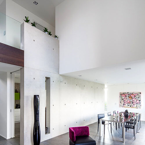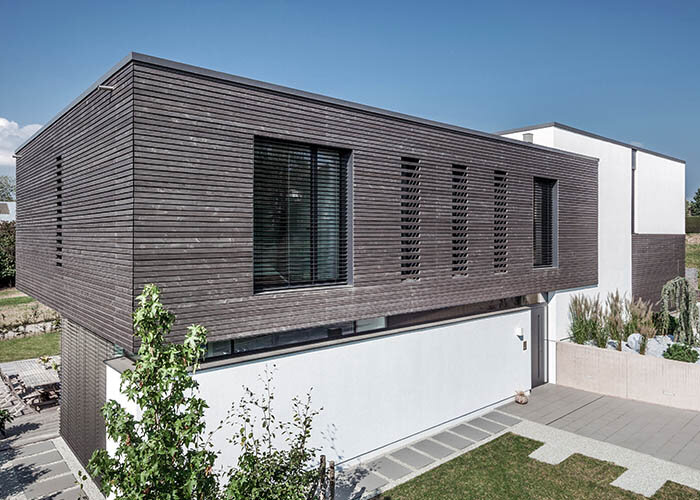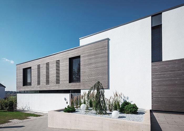 Aus Licht und Luft speist sich auch der Energiehaushalt des Gebäudes. Mittels Wärmepumpe versorgt die über die Luft gewonnene Energie das Niedrigenergiehaus mit Wärme und Brauchwasser, eine Lüftungsanlage mit Wärmerückgewinnung und Erdwärmetauscher sorgt für Luftaustausch und kühle Nächte im Hochsommer. Das Prinzip von Licht und Luft setzt sich auch in der Fassadengestaltung des Einfamilienhauses fort, für die weißer Putz mit Holz kombiniert wurde.