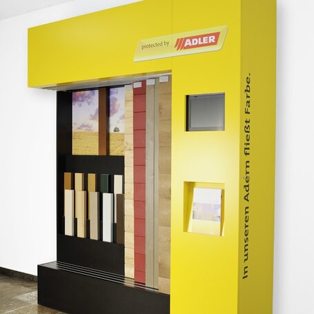 Mit den Protected by ADLER Shop-Elementen, wird die Fensterberatung zum Erlebnis. Dort finden nicht nur unterschiedlich beschichtete Musterflächen von Fenstern Platz, sondern lassen sich auch mit diversen Fassadenmustern kombinieren. An diesen Point-of-Sale-Modulen kann ein richtiges Beratungsgespräch stattfinden. Der Kunde sieht, wie das Fenster in seinem Haus wirken wird, wie es die Aussicht umrahmt und kann vor allem probieren, wie es sich anfühlt. Dann entscheidet am Ende nicht der Preis sondern eben das Gefühl – denn Holzfenster „protected by ADLER“ sind einfach zum Verlieben.