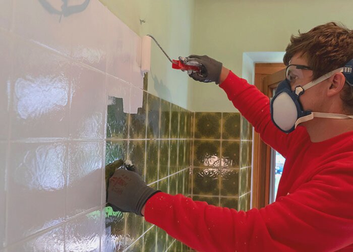 Ziehen Sie nun die passende Schutzkleidung an. Atemschutzmaske, Schutzbrille und Handschuhe. Danach mischen Sie die zwei Komponenten des 2K-PU-Multilacks zusammen und warten 10 Minuten, bevor Sie loslegen. Die Ecken und schwer zugängliche Stellen streichen Sie mit dem Pinsel. Dann wird die gesamte Fliesenfläche inkl. Fugen mit einem Lackroller aus lösemittelbeständigem Microfaser gewalzt.