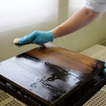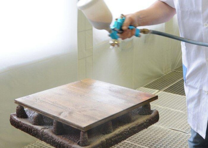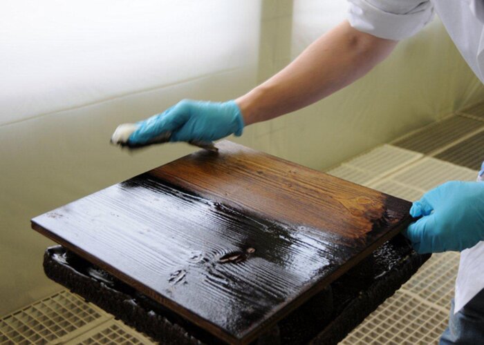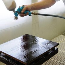 Jetzt ist die Fläche bereit für die dunkle Beize. In diesem Fall ist es die ADLER Arova Aqua-Classic im Farbton Nuss. Sie können die Beize spritzen oder streichen.