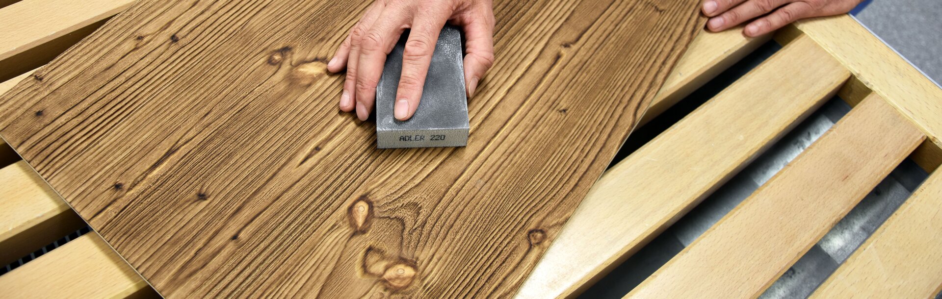Für die Grundierung können Sie sowohl Wasser- als auch Lösemittellacke verwenden. Nach einer Trockenzeit von sechs (für Wasserlacke) bis zwölf Stunden (für Lösemittellacke) bzw. noch besser über Nacht können Sie die erste Schicht Decklack auftragen. Stefan Oberladstätter empfiehlt als Decklack ADLER Pur-Naturmatt oder alternativ dazu ADLER PUR-Antiscratch HQ G5. Für hellere Farbtöne sollten Sie einen lichtechten Decklack wie z.B. ADLER Legnopur oder ADLER Aqua-Resist wählen, um den Farbton des gebeizten Holzes optimal zu schützen.