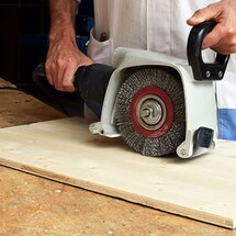 Am besten wirkt der Altholz-Look auf stark gebürstetem Fichtenholz oder auf Fichtenstarkfurnier. Bürsten Sie das Holz kräftig – am besten maschinell – mit der Stahlbürste, um die harten Jahresringe gut herauszuarbeiten und so eine markante Optik zu erzielen.