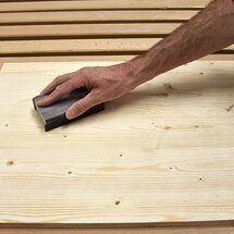 Wenn der Grundlack angetrocknet ist, schleifen Sie die Oberfläche vorsichtig entlang der Jahresringe mit einem Schleifschwamm in Körnung 220. Danach können Sie die Oberfläche decklackieren.