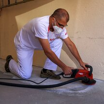 Der Boden wird zuerst mit dem Besen gereinigt und dann geschliffen – so entfernen Sie lose Estrichteile und Sinterschichten und verbessern die Saugfähigkeit. Je schlechter die Untergrund-Prüfung ausgefallen ist, desto gründlicher muss geschliffen werden. Arbeiten Sie sich mit dem Schleifgerät sorgfältig über die gesamte Fläche und saugen Sie anschließend Schleifstaub und Schmutz ab.