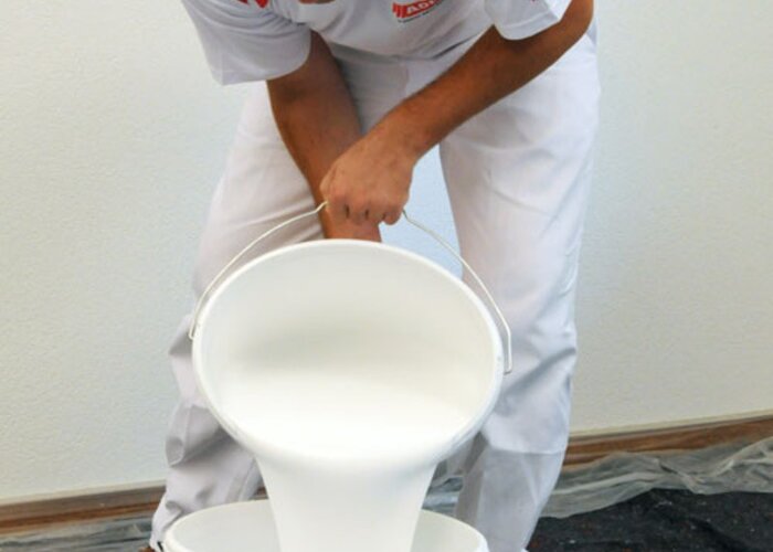 Sauberer leerer Farbeimer – Die Farbe sollten Sie vor dem Malen im Originalfarbeimer mit einem Rührholz gründlich aufrühren, um die Pigmentpartikel wieder gleichmäßig zu verteilen, die bei längerer Lagerung zu Boden sinken können. Wenn Sie die Farbe verdünnen möchten, tun Sie dies in diesem Eimer. Bitte beachten Sie die angegebenen Mengenverhältnisse. Danach schütten Sie die nötige Farbe in einen leeren Farbeimer, den Sie kostenlos bei Ihrem ADLER-Farbenmeister bekommen.