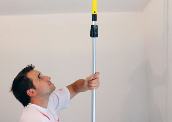Teleskopstange / -verlängerung – Statt mit einer Leiter zu arbeiten, sollten Sie auf eine Teleskopstange setzen. So entlasten Sie Ihren Nacken bei anstrengenden Überkopfarbeiten und entgehen der Sturzgefahr.