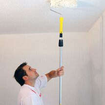 Teilen Sie die Fläche geistig in Bahnen ein und streichen Sie überlappend immer vom Fenster in den Raum hinein. Wenn Sie mit dem ersten Deckenanstrich fertig sind, lassen Sie die Farbe 3-4 Stunden trocknen. In der Zwischenzeit können Sie die Wände ausmalen. (Auch das funktioniert am besten, wenn Sie zuerst die Kanten mit dem Pinsel beschneiden und dann die Bahnen nass in nass rollen.) Für einen perfekten Anstrich empfiehlt es sich, alle Flächen zweimal zu streichen. Die Arbeitsgeräte reinigen Sie unter fließendem Wasser.