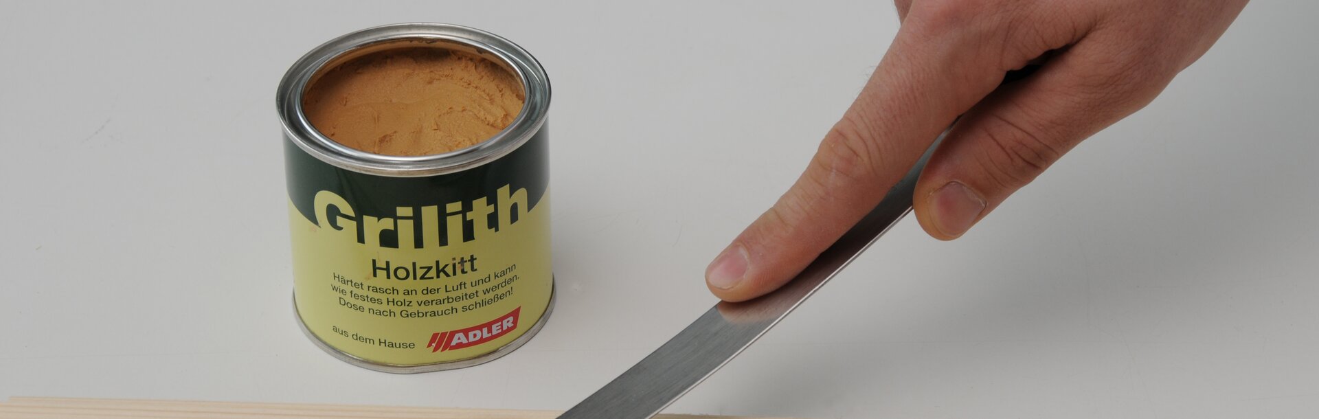 Kleine Risse, ausgefallene Äste, schlechte Furnierfugen – keine Seltenheit bei der Arbeit mit Holz. Bessern Sie all diese kleinen Schönheitsfehler vor dem Beizen und Lackieren noch auf dem rohen Holz aus, um ein perfektes Ergebnis zu bekommen. Den ADLER-Holzkitt dazu einfach mit einer Spachtel in die Schadstelle eindrücken. Große Fehlstellen sollten Sie mehrmals auskitten, da das Füllmaterial nachgibt: im Fachausdruck „Nachfallen“ des Kittes.