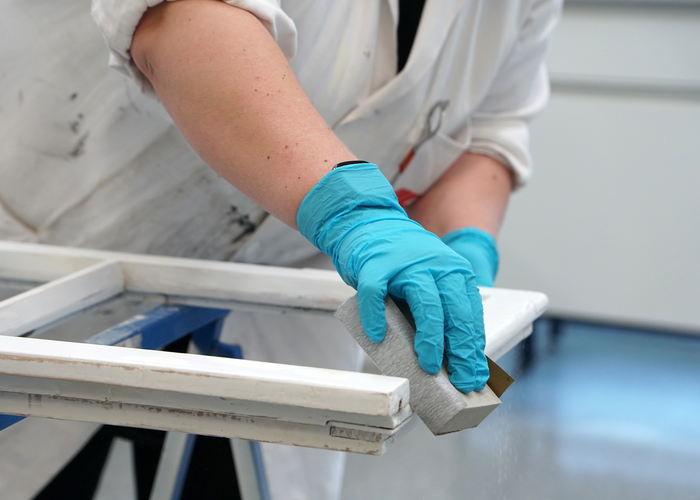Schleifen Sie Fensterflügel und -stock mit Körnung 100-150 (Nadelhölzer) bzw. 150-180 (Laubhölzer) an und entfernen Sie den Schleifstaub.