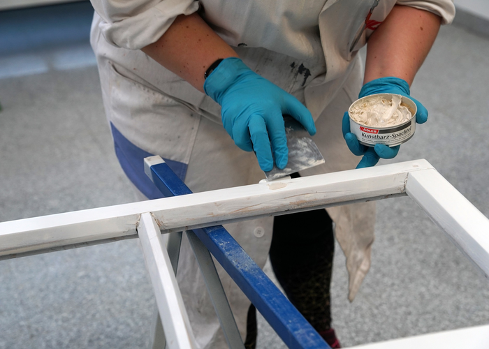 Fugen und andere Schäden in der Oberfläche können Sie mit ADLER Kunstharz-Spachtel ausbessern. Lassen Sie die Spachtelmasse 16 Stunden trocknen und schleifen Sie sie dann mit Körnung 120 glatt.
