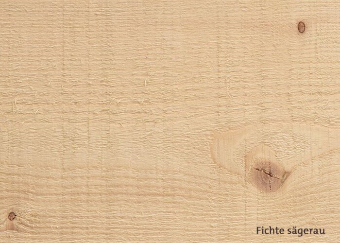 - Sägerau: Sägeraues Holz hat ein hohes Saugvermögen. Es nimmt den Anstrich hervorragend auf. Vor der Beschichtung reinigen Sie die sägeraue Oberfläche unbedingt von losen Holzpartikeln. (Siehe Muster in der Bildergalerie)