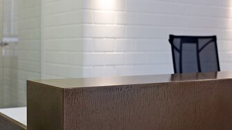 Wohl kaum einem Bereich kommt in der Gestaltung öffentlicher Räume so viel Bedeutung zu wie dem Entrée. Es ist wie mit der Liebe – der erste Blick entscheidet: Deshalb haben die Architekten von „hausgemacht GBR“ in ihrer Neugestaltung des Notariats in Rastatt, Baden-Württemberg, auch ganz besonderen Wert auf die Wirkung des Empfangsbereichs gelegt. „Wir wollten mit unserem Entwurf Seriosität vermitteln und trotzdem eine zeitgemäße Gestaltung mit Wiedererkennungswert schaffen“, erläutert Sonja Böhr von hausgemacht ARCHITEKTEN. Im Mittelpunkt ihres Konzepts steht ein Empfangstresen. Und der ist wahrlich nicht zu übersehen. Das langgestreckte Möbel besteht aus zwei Kuben, die sich gegenseitig durchdringen. Dadurch ergeben sich unterschiedliche Höhen für die verschiedenen Funktionen der Theke. Die klare Linienführung vermittelt den gewünschten vertrauenswürdigen Eindruck. Doch zum optischen Highlight und identitätsstiftenden Mittelpunkt des Notariats macht den Tresen erst die harmonische Kombination von zwei Oberflächen. Während der höhere Teil des Möbels aus elegantem weißem Corian besteht, kam für die zweite Hälfte eine ganz besonders eindrucksvolle Lackierung zum Einsatz: Sie schimmert in einem edlen metallischen Bronze-Glanz.