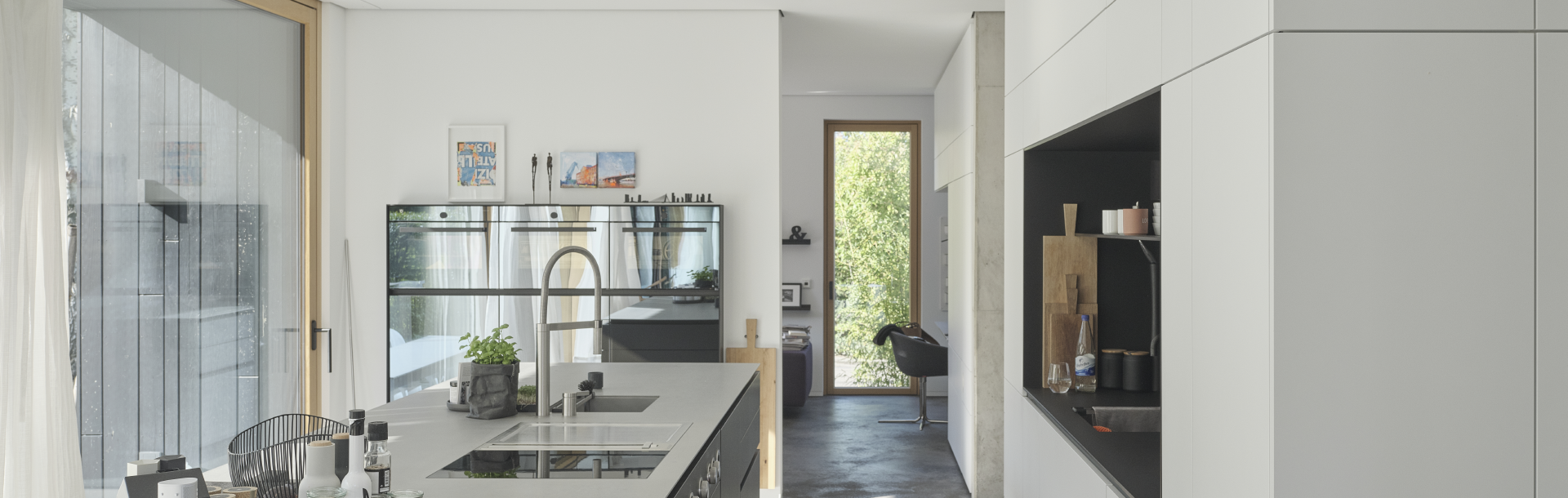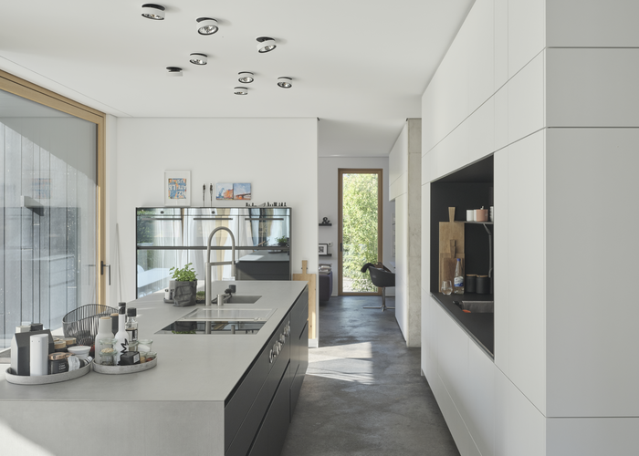 Ergänzt wird die durchdachte Gestaltung und klare Linienführung durch zahlreiche hochwertige Einbaumöbel, die Thomas Mainzer und sein Team in den eigenen Werkstätten gefertigt haben: Wandschränke und Stauraumlösungen, beschichtet mit PUR-Ecofill Weiß, Pigmopur in Weiß und PUR-Antiscratch HQ. Sowie die im Objekt integrierte Küche inklusive einem Sondermöbel für die Einbaugeräte mit einer silbrig spiegelnden, tiefschwarzen Glasfläche, die mit einer speziellen Glaslackierung (Pigmopur RAL 9005 mit Pigmofix G) umgesetzt wurde. Angesichts der eindrucksvollen, atmosphärischen Kombination von Farben und Materialien wundert es nicht, dass Katrin und Thomas Mainzer ihre Kunden auch gerne durch ihr privates Wohnreich führen – als eindrucksvolles Beispiel, wie sich Entwurf und Ausführung eben doch zu einem Schmuckstück zusammenführen lassen!