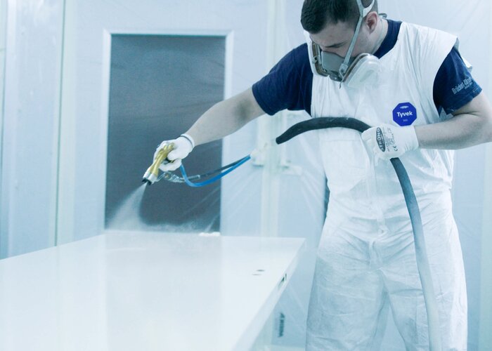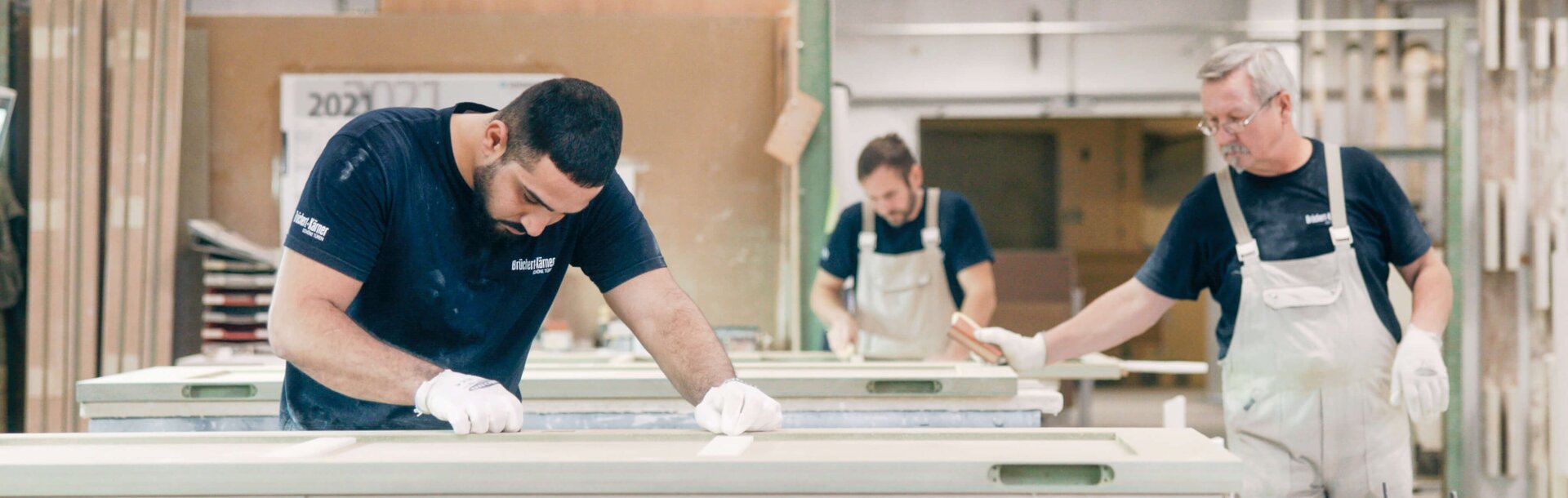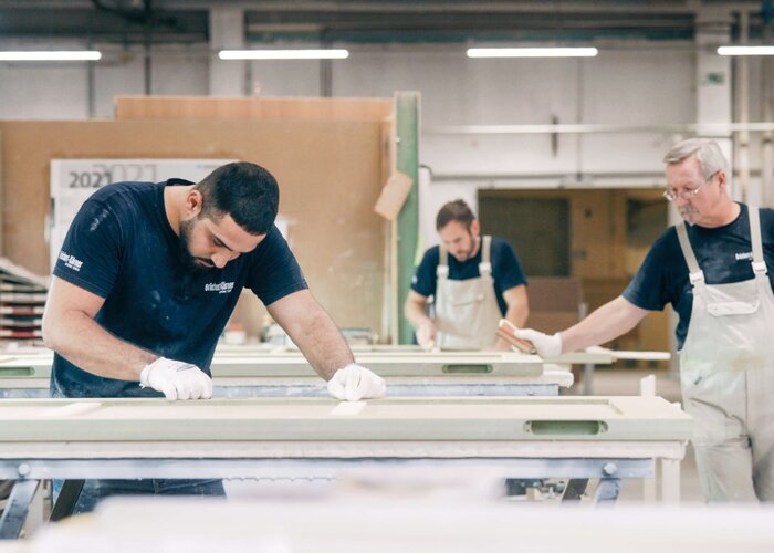 Dafür setzt das Unternehmen, ganz im Stil einer „Türen-Manufaktur“, vor allem auf eines: auf die handwerkliche Meisterschaft der 130 Mitarbeiter/-innen. Das gilt besonders für die Oberflächenabteilung, in der die wasserbasierten Beschichtungen von ADLER verarbeitet werden. Am Spritzstand werden die Türen zuerst zweimal mit Bluefin Isospeed von ADLER grundiert. Dann geht es an die Königsdisziplin, den Lackschliff: Nach den althergebrachten Prinzipien eines klassischen Schleiflack-Aufbaus wird die Fläche in sorgfältiger Handarbeit geglättet, um so die Grundlage für eine makellose Oberfläche zu schaffen. Für diese sorgt Bluefin Pigmosoft von ADLER. Der 2K-Lack verleiht den Türen eine elegante, stumpfmatte Oberfläche mit angenehmem, softem Griff und ausgezeichneter Kratzfestigkeit. Dazu bringt die Beschichtung noch eine weitere Eigenschaft mit, die bei Innentüren besonders wertvoll ist: Durch eine innovative Rezeptur verfügt Bluefin Pigmosoft über eine einzigartige Selbstregenerationsfähigkeit. So ist der Lack hervorragend vor Fingerabdrücken und aufglänzenden Stellen geschützt, kleine Kratzer in der Lackoberfläche verschwinden über Nacht wie von selbst.