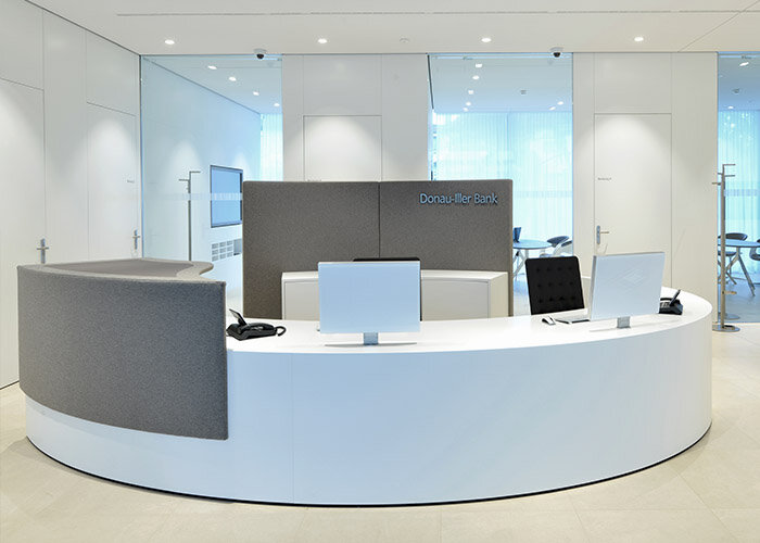 Reduziert, dezent, elegant: So präsentiert sich die Empfangstheke der neuen Donau-Iller-Bank in Ehingen, Baden-Württemberg, Deutschland.Und gerade in ihrer Schlichtheit zieht das Möbel die Besucher in seinen Bann. Es ist die außergewöhnliche Form, die besondere Farbe und die vollendete Gestaltung, die den Eingangsbereich zum Hingucker machen und perfekt vermitteln, was man als Bank ausdrücken will: Hier herrscht Offenheit, Transparenz – und das alles mit dem gewissen bisschen Schwung. Denn die Empfangstheke ist geschwungen. In einer sanften Sichelform schmiegt sie sich um die Mitarbeiter und wird mit der Rückwand zur Ellipse.