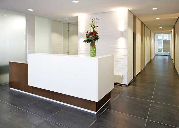 Deshalb haben die Architekten von „hausgemacht GBR“ bei der Neugestaltung des Notariats im deutschen Rastatt besonderen Wert auf die Wirkung des Empfangsbereichs gelegt. „Wir wollten mit unserem Entwurf Seriosität vermitteln und trotzdem eine zeitgemäße Gestaltung mit Wiedererkennungswert schaffen“, erläutert Sonja Böhr von hausgemacht ARCHITEKTEN. Im Mittelpunkt des Konzepts steht ein Empfangstresen. Und der ist nicht zu übersehen!