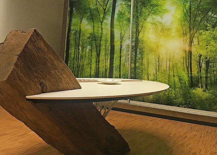 Das Löw-Breidenbach-Team, zu dem übrigens auch der Sohn von Michael Schneider gehört, ist von den ADLER Metalleffekten so begeistert, dass es auch für die Gestaltung des eigenen Schauraums auf die Bronze-Beschichtung zurückgegriffen hat. „Dabei war der Plan für den Ausstellungsbereich eigentlich nur aus der Not geboren, weil sich ein Reporter angekündigt hatte und wir etwas zum Herzeigen haben wollten“, schmunzelt Löw. Mit einem wie aus dem Boden gewachsenen Tisch vor dem eindrucksvollen Schrank mit einem Waldmotiv im Metalleffekt-Rahmen ist dieser Wunsch in Erfüllung gegangen.