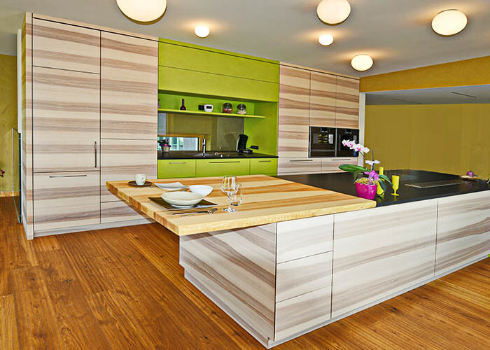 „Wir waren gerade in der Endplanung unserer eigenen Küche und wollten ein frisches Grün mit gebürsteter, weiß gebeizter Kernesche kombinieren“, berichtet Martin Heilos. Warum also nicht grüner Beton? Er suchte und fand seinen Wunschfarbton: „Von den ADLER-Farbprofis bekamen wir die perfekt gemischten Materialien für die Bemusterung“, lobt er. Überhaupt sorgte der langjährige Lackpartner aus Tirol für die gelungene Oberflächenqualität.