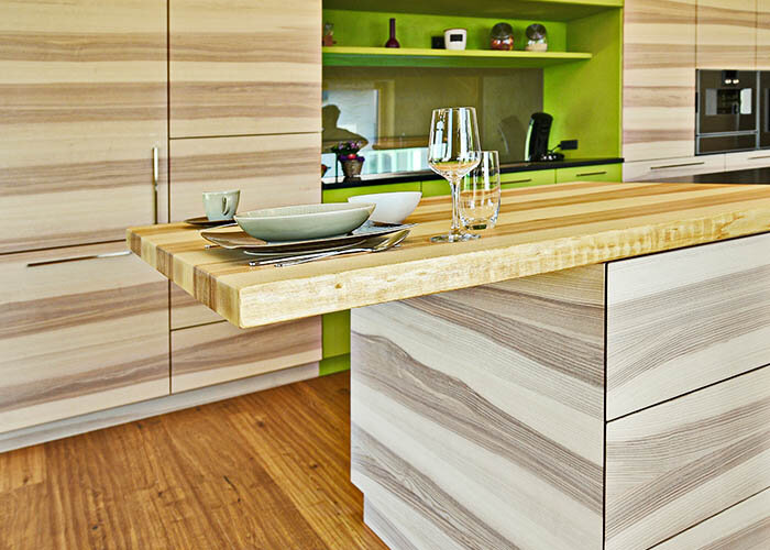 Die Kernesche-Dreischichtplatten wurden mit ADLER Spritzbeize Weiß elegant aufgehellt, für die Beständigkeit sorgt der Decklack ADLER Aduro Vento im Glanzgrad G10. So stellen sie eine stimmige Ergänzung zu den Betoneffekt-Flächen im hellgrünen Sonderfarbton dar, den eine elegante, tiefschwarze Arbeitsplatte abrundet. „In diesem Bereich konnten wir uns auf die kompetente Beratung von Steinmetz Richard Ehrlich verlassen“, sagt Martin Heilos. Mit ihm arbeitet die Tischlerei immer wieder zusammen – schließlich gehören exklusive Küchen zu den gefragtesten Stücken aus Heilos-Hand.