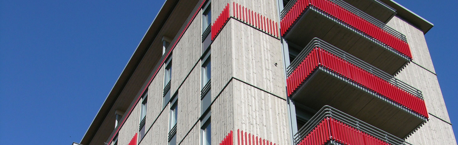 Die Holzmassivwände aus vertikal angeordneten Fichte-Hölzern wurden direkt im Werk von Huber & Sohn in Bachmehring gefertigt. „Wir haben das Gebäude dann aus den vorgefertigten Holzelemente innerhalb kürzester Zeit aufgestellt“, sagt Projektleiter Jens Eitner von B & O. „Pro Stockwerk hat das zwei bis drei Tage gedauert – das heißt wir können so ein achtgeschossiges Hochhaus innerhalb von vier Wochen errichten. Das ist einfach sensationell.“ Die Fertigung direkt im Holzbaubetrieb ermöglicht eine scharf akzentuierte Fassade mit präzisen Materialübergängen. Trotzdem bleibt das typische, weiche Erscheinungsbild der sägerauen Bretter erhalten. Sogar die Fenster wurden schon beim Holzbaubetrieb in die Wandelemente eingebaut. Die Fassadenverkleidung aus Vollholz ist schon fertig beschichtet, wenn die Elemente den Holzbauer verlassen.
