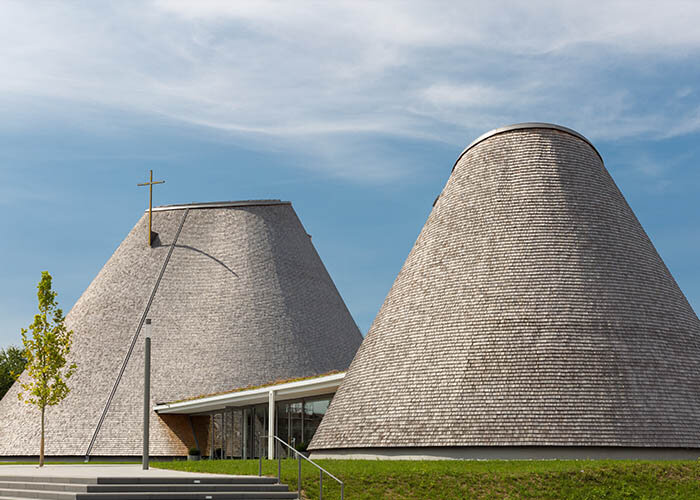 Eine Kirche bauen – oft bietet sich diese Gelegenheit heutzutage nicht mehr. Dabei ist für Eberhard Wimmer der Kirchenbau „die Königsdiziplin der Architektur“ – in der er schon einige Erfahrung gesammelt hat: Die Kirche St. Josef in Holzkirchen ist bereits der zweite Sakralbau nach einem Entwurf des Münchener Architekten. Sie definiert den Glaubensraum auf beeindruckend moderne Weise: Unter einem lichten Holzkegel versammelt sich die Gemeinde um den Altar, ganz dem Geiste des zweiten vatikanischen Konzils entsprechend. Eine zeitgemäße Interpretation der Vorgängerkirche, die zwar erst 1962 eröffnet wurde, vor einigen Jahren aber aufgrund grober statischer Mängel abgerissen werden musste. Ihre zeltförmige Gestaltung nehmen nun die beiden kegelstumpfförmigen Neubauten von Kirche und Kapelle wieder auf. Von außen mögen die Kuppeln mit ihren vergrauten Lärchenschindeln schlicht und zurückhaltend wirken – im Inneren offenbaren sie beeindruckende Größe. Die zentrale Lichtöffnung zieht die Blicke nach oben, an den weißen Ringen und Dreiecken entlang, die zugleich Wand und Decke bilden. Eine meisterliche Konstruktion, die in ihrer Rundform Anfang und Ende symbolisiert und aus dem wohl passendsten aller Baustoffe für eine Kirche in Holzkirchen geschaffen wurde: aus Holz.