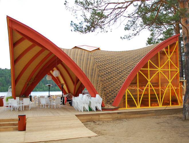 Ein buntes Schmuckstück ist der Cafépavillon des Feriendorfes „Baikal“ im russischen Irkutsk, malerisch gelegen am Ufer des Flusses Angara. Er ist in bester Holzbau-Tradition russischer Baukunst ausgeführt und jetzt innen wie außen farbenfroh geschützt mit ADLER Lignovit.