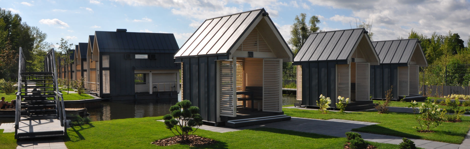 Das Ökoresort Kilov liegt im pittoresken Umland von Kiew, am Fluss Dniper. Es ist weit genug weg, um all den Lärm und Trubel der Großstadt vergessen zu machen, und doch nah genug, um den Hauptstädtern ein ideales Wochenend- und Urlaubsziel zu sein. Für das Freizeitprogramm sorgt Mutter Natur selbst: Frische Luft und lichter Wald laden zu Wanderungen ein, doch die Hauptattraktion ist das Wasser: Ein Großteil der Besucherinnen und Besucher kommt zum Fischen hierher. Aufgrund der Nähe zum Wasser und des zu weichen Untergrunds aus Torferde entschied man sich für zwei Arten von Ferienhäuschen: beide direkt im Wasser, anstatt nur am Wasser. Die Gebäude sind auf schwimmenden Trägerflächen nach Art von Hausbooten oder auf Pfahlgerüsten errichtet. In Form und Material erinnern die zweigeschossigen Holzhäuschen mit Satteldach an die gute alte Datscha von früher, warten jedoch innen mit jeglichem Komfort auf und bieten mit bodentiefen, großflächigen Fensterfronten eine wunderbare Sicht auf den Dniper und das Umland.
