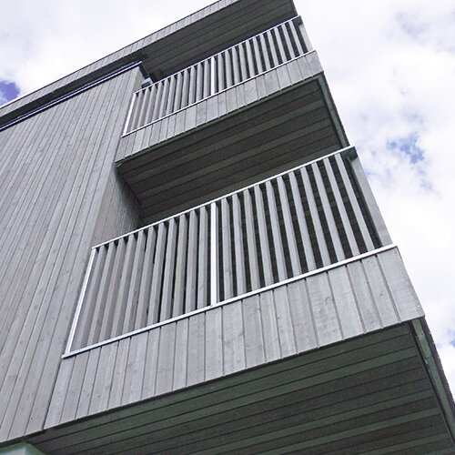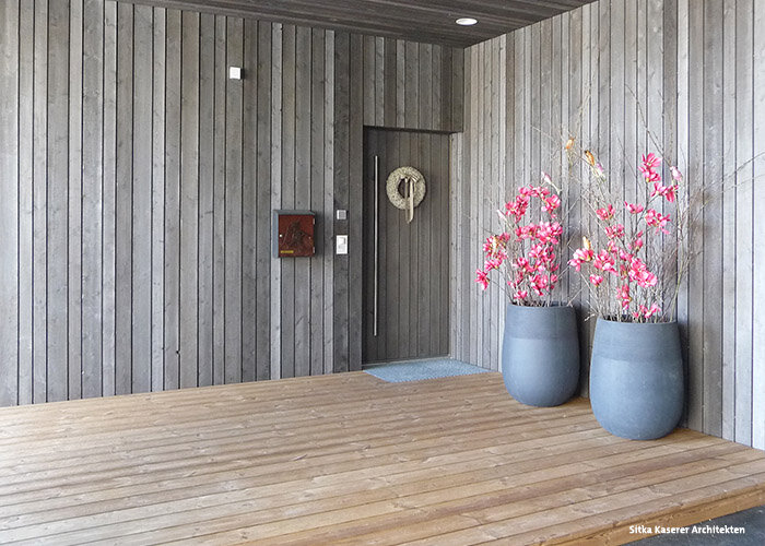 Auch der Blick aus der Bergwelt in die andere Richtung – auf Haus und Hang – ist stimmig. Das Gebäude ist zwar modern, aber knüpft dennoch an die Tradition alpiner Bauweise an. Außen wurde das Haus mit einer Fassade aus sägerauem Lärchenholz in unterschiedlichen Brettbreiten und Nut-Feder-Verbindung mit Schattenfuge gestaltet. Der Familienbetrieb Holzbau Gläser hat die Fassade gefertigt und bereits vor der Montage beschichtet. Aussehen sollte alles natürlich und alpin, das Holz aber trotzdem bestmöglich vor den starken Witterungseinflüssen geschützt sein. Also fiel die Wahl auf die effektvolle Vorvergrauungslasur Pullex Silverwood im Farbton Graualuminium. Die Lasur dringt ins Holz ein, schützt es, lässt es aber trotzdem wie unbeschichtet aussehen. Stattdessen sorgt sie für eine gleichmäßige, silbrige Vergrauung, die an einen schönen Heustadel aus dem Gebirge erinnert. So verschmelzen moderne Gestaltung und optische Tradition zu einem neuen Ausdruck und machen das Haus im Hang zu einem steilen Hingucker.